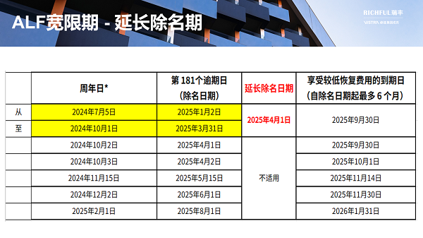 *如果周年日期是周末或公共假期,F(xiàn)SA將在隨后的下一個工作日接受 ALF 申請,不會受到任何處罰,但這不會改變除名日期的計算或較低的恢復費用期限。