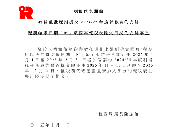 香港稅務(wù)局于2025年10月2日發(fā)布最新通告,為緩解企業(yè)年底申報(bào)壓力,正式延長(zhǎng)結(jié)賬日期「M」類(lèi)公司(即財(cái)政年度結(jié)賬日期在2025年1月1日至3月31日之間)的2024/25年度利得稅申報(bào)期限——由原定的2025年11月17日延后兩周至2025年12月2日。本次延期旨在為企業(yè)提供更多準(zhǔn)備時(shí)間,但需注意12月2日為最終截止日,逾期將面臨合規(guī)風(fēng)險(xiǎn)。