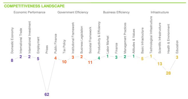 全球競爭力報(bào)告報(bào)告覆蓋了全球67個(gè)經(jīng)濟(jì)體,并對(duì)這些國家在經(jīng)濟(jì)表現(xiàn)、政府效率、商業(yè)活力和基礎(chǔ)設(shè)施建設(shè)等四大領(lǐng)域的表現(xiàn)進(jìn)行了全面的評(píng)估,包含了164項(xiàng)競爭力指標(biāo)。