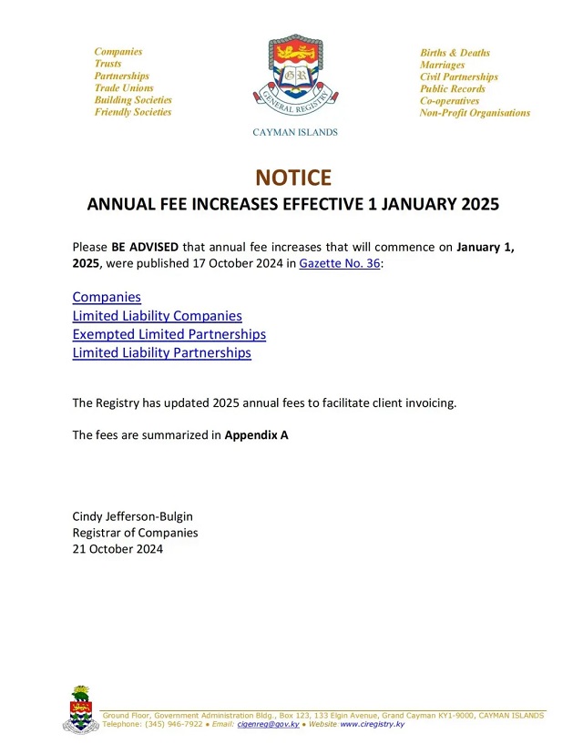 根據(jù)開曼群島金融服務(wù)部于2024年10月21日正式發(fā)布的公告,隨著《公司法》(2024年附表5 修正案),《有限責(zé)任公司(費(fèi)用)》(2024年修正案),《豁免有限合伙企業(yè)(第2號)實(shí)施細(xì)則》(2024年修正案),《有限責(zé)任合伙企業(yè)(費(fèi)用)實(shí)施細(xì)則》(2024年修正案) 等一系列修正案在政府憲報(bào)刊登,公司、有限責(zé)任公司、豁免有限合伙企業(yè)和有限責(zé)任合伙企業(yè)的年費(fèi)變更將于2025年1月1日正式生效。