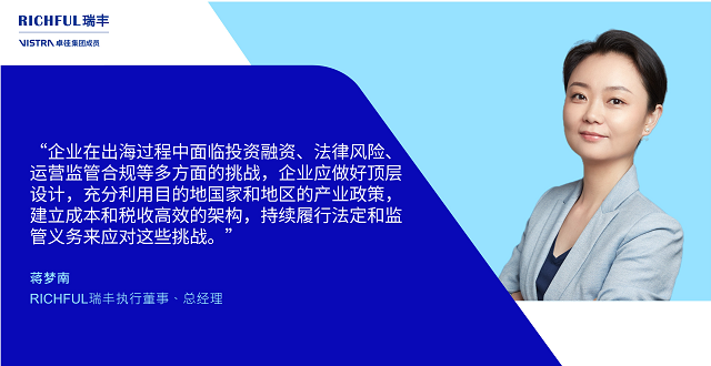 除了金融服務(wù),企業(yè)出海還需考慮多方面因素。RICHFUL瑞豐執(zhí)行董事、總經(jīng)理蔣夢南與《中國經(jīng)營報(bào)》記者分享,企業(yè)在出海過程中面臨投資融資、法律風(fēng)險(xiǎn)、運(yùn)營監(jiān)管合規(guī)等多方面的挑戰(zhàn),企業(yè)應(yīng)做好頂層設(shè)計(jì),充分利用目的地國家和地區(qū)的產(chǎn)業(yè)政策,建立成本和稅收高效的架構(gòu),持續(xù)履行法定和監(jiān)管義務(wù)來應(yīng)對這些挑戰(zhàn)。