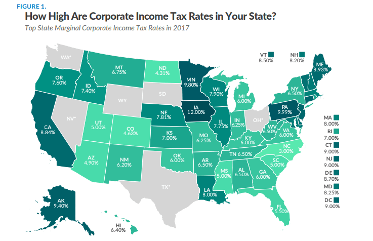 44個(gè)州征收企業(yè)所得稅。稅率從北卡羅萊納州的3%到愛荷華州的12%。