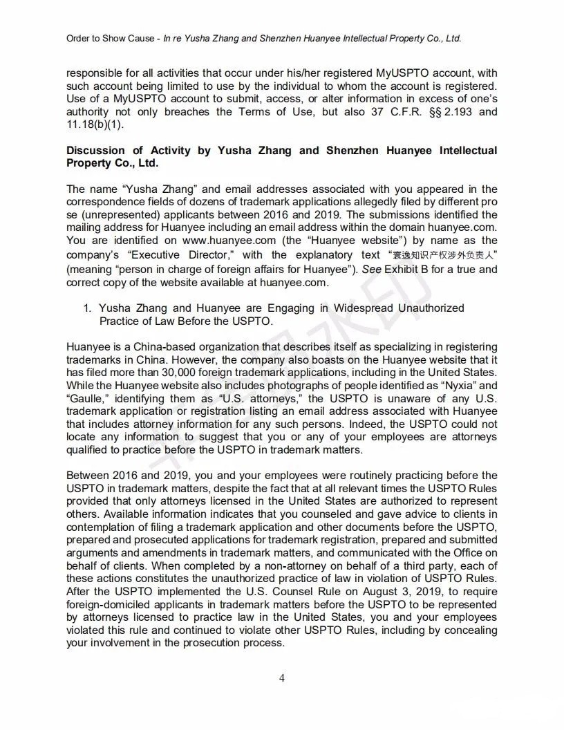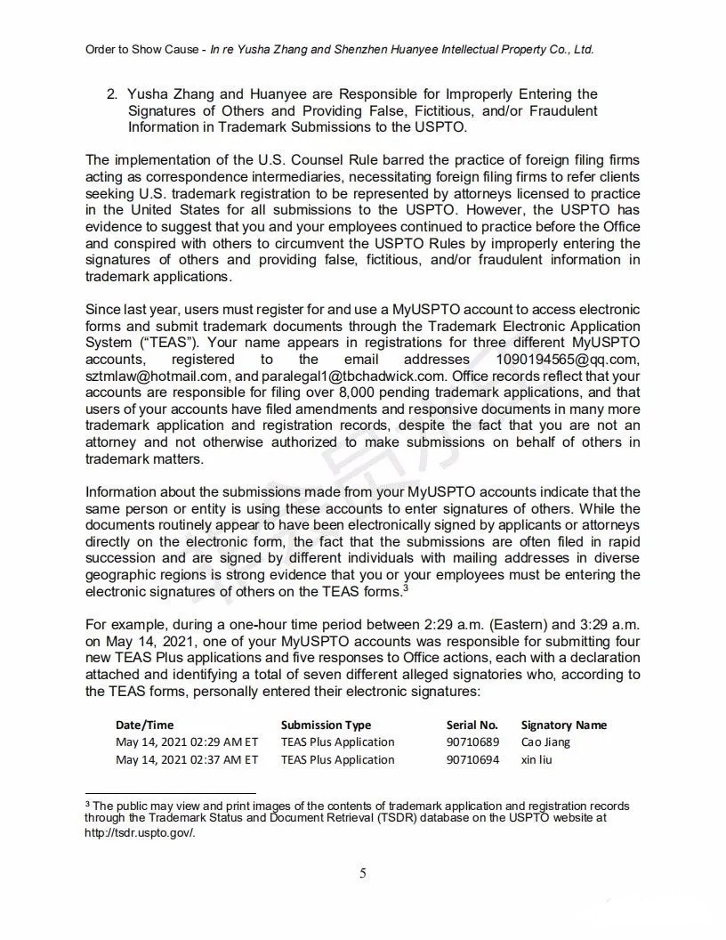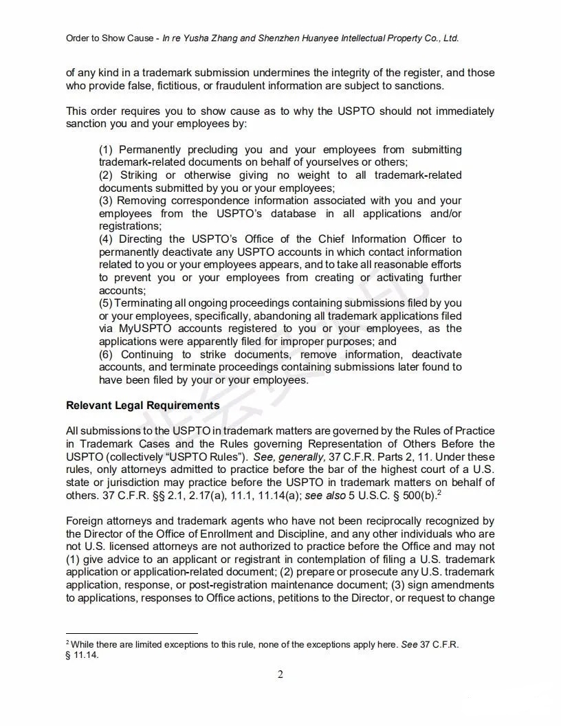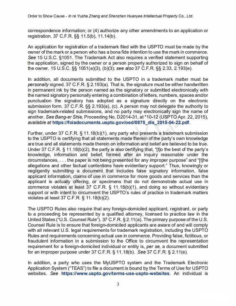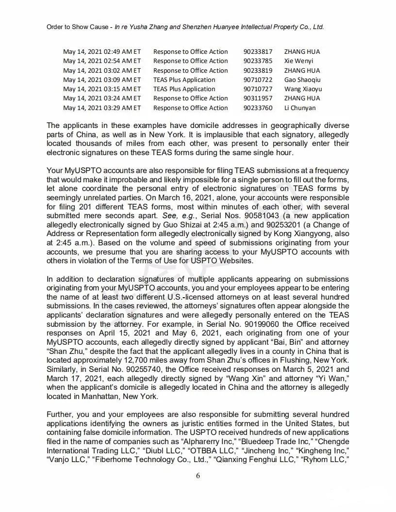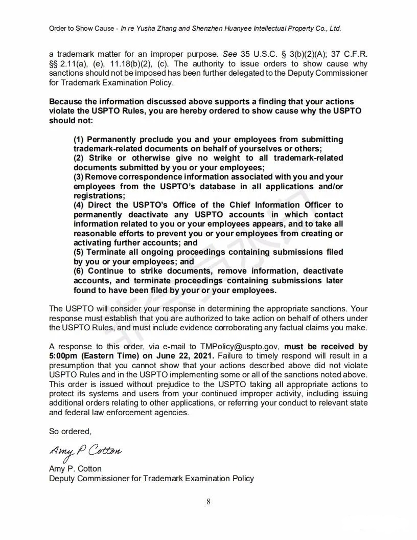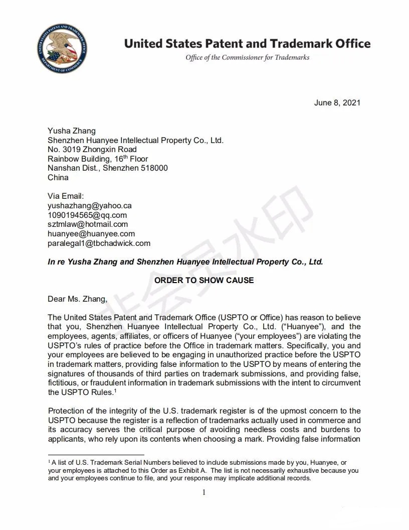 2021年6月8日,美國(guó)專利商標(biāo)局(USPTO)向中國(guó)深圳一家知識(shí)產(chǎn)權(quán)公司的代表人發(fā)出一份123頁(yè)的“ORDER TO SHOW CAUSE”。對(duì)該公司代理提交的批量美國(guó)商標(biāo)的行為,尤其是其中涉及到第三方簽名提供虛假、虛構(gòu)和欺詐信息的行為提出質(zhì)疑,要求該公司提出合理的理由,并在美國(guó)東部時(shí)間6月22日下午5:00前進(jìn)行回復(fù)。否則USPTO將會(huì)對(duì)該代理機(jī)構(gòu)以及代表人進(jìn)行制裁。