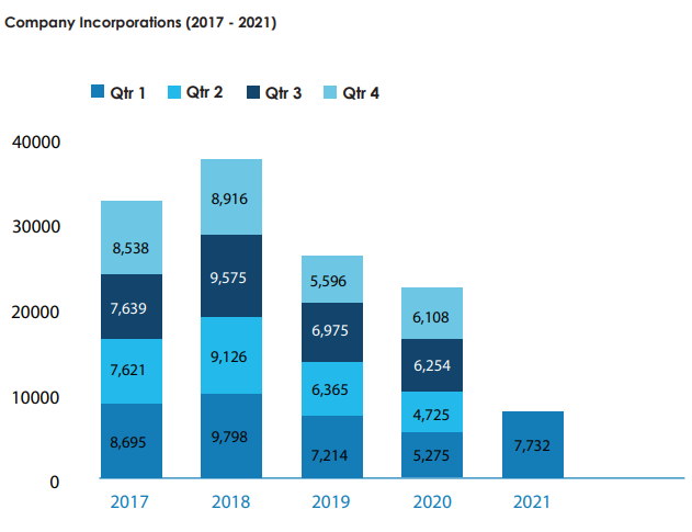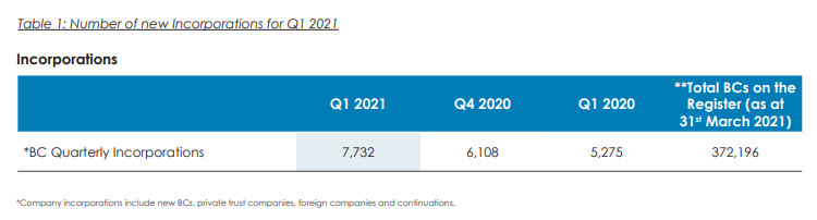從統(tǒng)計數(shù)據(jù)看,BVI公司在2021 年第一季度設立公司7,732家,較2020年下半年的數(shù)字上升26.59%。截至3月31日,在BVI設立的公司總數(shù)達到了372,196家。
