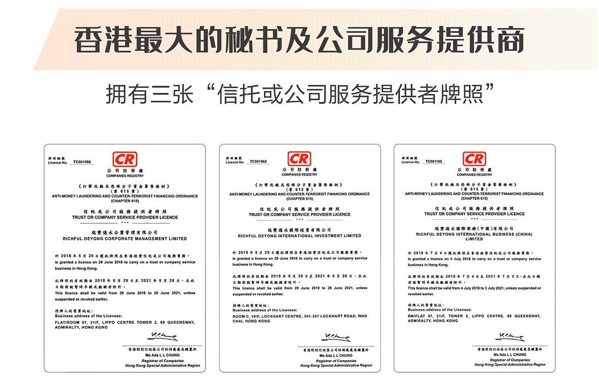 瑞豐德永是亞洲具有領先地位的專業(yè)服務機構,是香港最大的秘書及公司服務提供商,擁有三張“信托或公司服務提供者牌照”。
