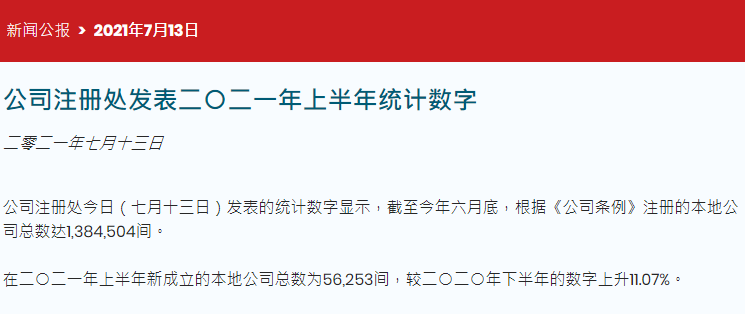 7月13日,香港公司注冊處發(fā)表2021年上半年統(tǒng)計數(shù)字,統(tǒng)計數(shù)字顯示,截至今年六月底,根據(jù)《公司條例》注冊的本地公司總數(shù)達1,384,504間。在2021年上半年新成立的本地公司總數(shù)為56,253間,較2020年下半年的數(shù)字上升11.07%。